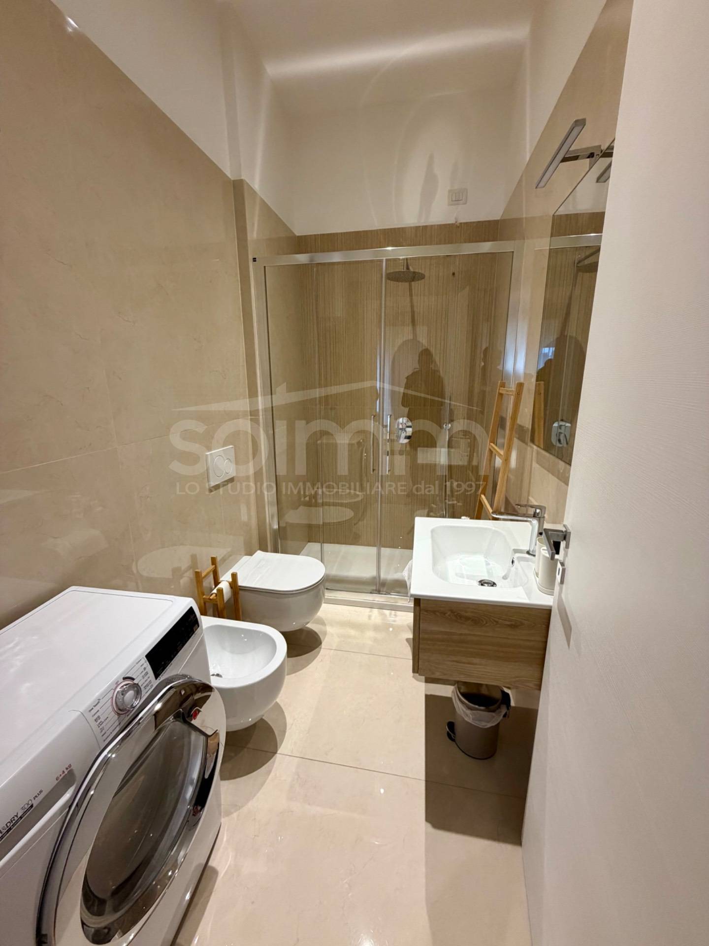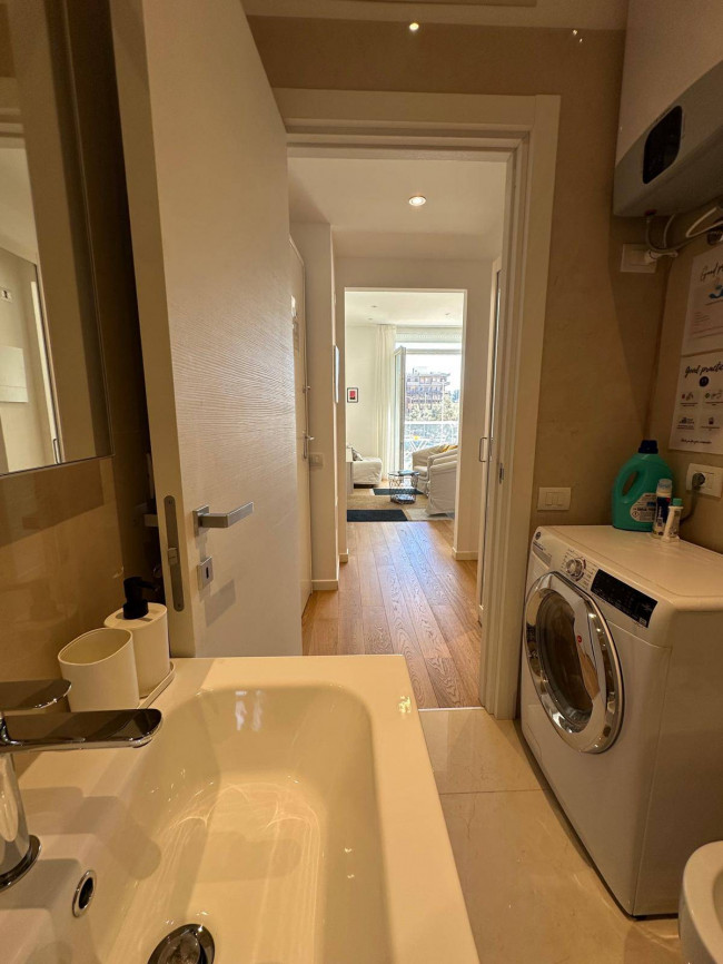 Il bagno è moderno e funzionale, dotato di doccia su misura, pavimentazione e rivestimenti in grès porcellanato e sanitari sospesi.