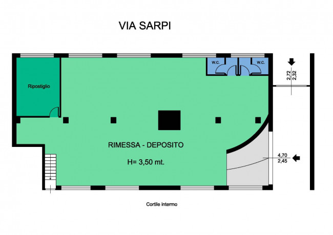 Il locale oltre cha da una rampa carrabile è accessibile da un accesso pedonale posto sul cortile condominiale ed è composto da un locale unico open space, un locale di sgombero e due servizi igienici. È caratterizzato da una pianta regolare, un’altezza di 3,50 mt e sono presenti delle finestre alte a vasistas su due lati e per tutta la lunghezza che gli conferiscono una discreta luminosità e gli garantiscono un buon ricambio d’aria. E’ presente il CERTIFICATO DI AGIBILITÀ.